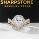 A luxurious sterling-silver bridal set featuring a striking pear-cut moissanite centerpiece framed by a shimmering pavé halo.