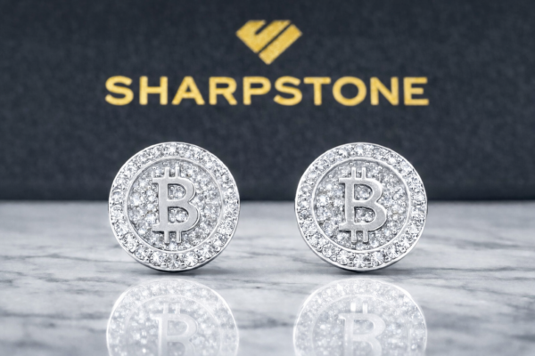 The iconic Bitcoin symbol stands out in a fully encrusted center.