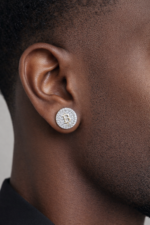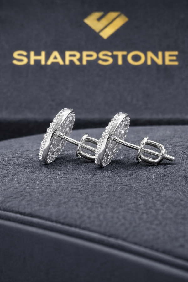 These sterling silver earrings feature a circular design adorned with round-cut pavé moissanite stones.