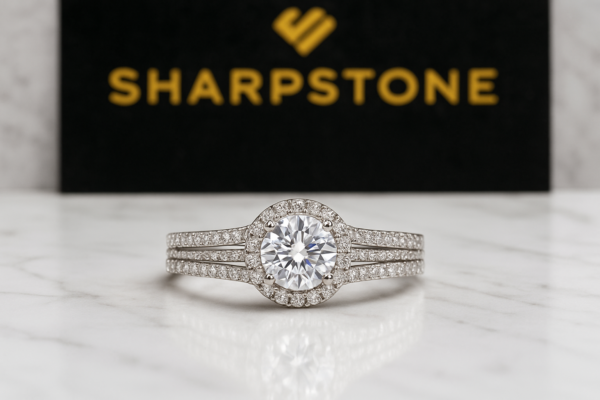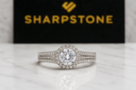 This exquisite sterling silver ring features a brilliant oval-cut moissanite center stone, framed by a sparkling round-cut halo and elegant scalloped side clusters.
