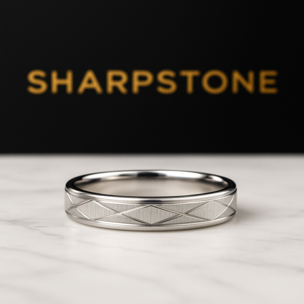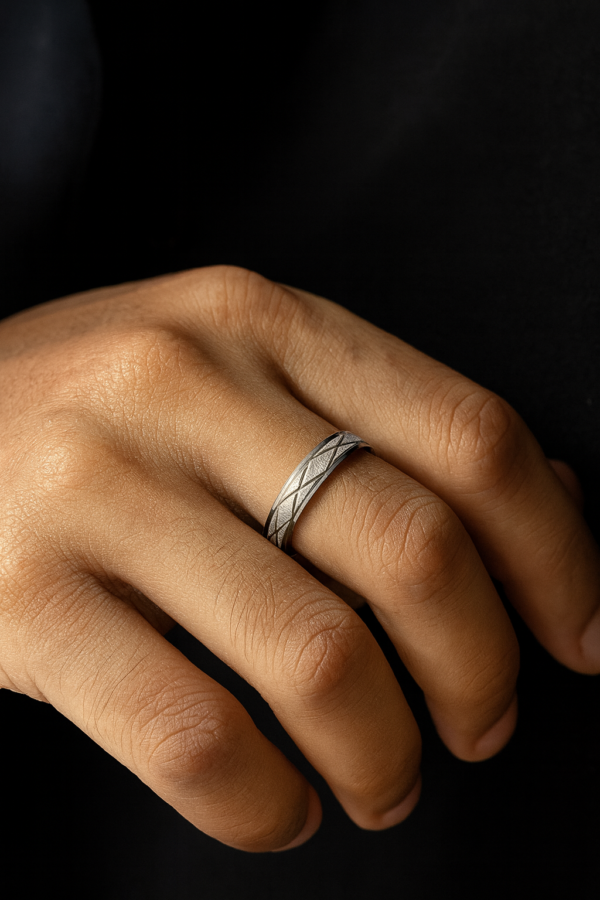 This elegant criss cross slim titanium band combines a smooth high-shine edge with a detailed geometric-etched center. Designed for timeless style and everyday comfort.