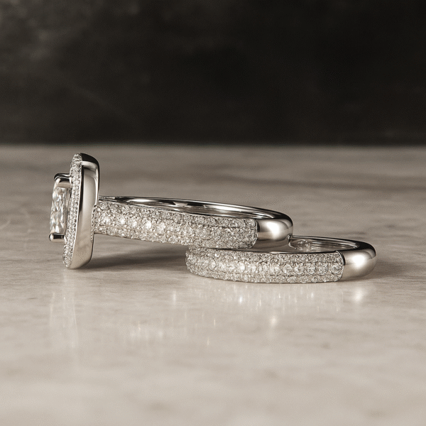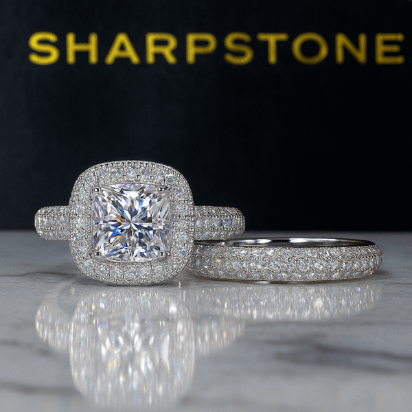 A dazzling bridal set crafted in premium sterling silver, featuring a radiant cushion-cut moissanite center wrapped in a double halo. Paired with a fully pavé-set band, this set delivers timeless sparkle and refined elegance.