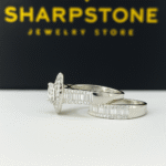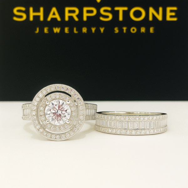 A glamorous round-cut double-halo ring paired with a wide baguette-and-round cubic stone band. Crafted in sterling silver for an opulent finish.