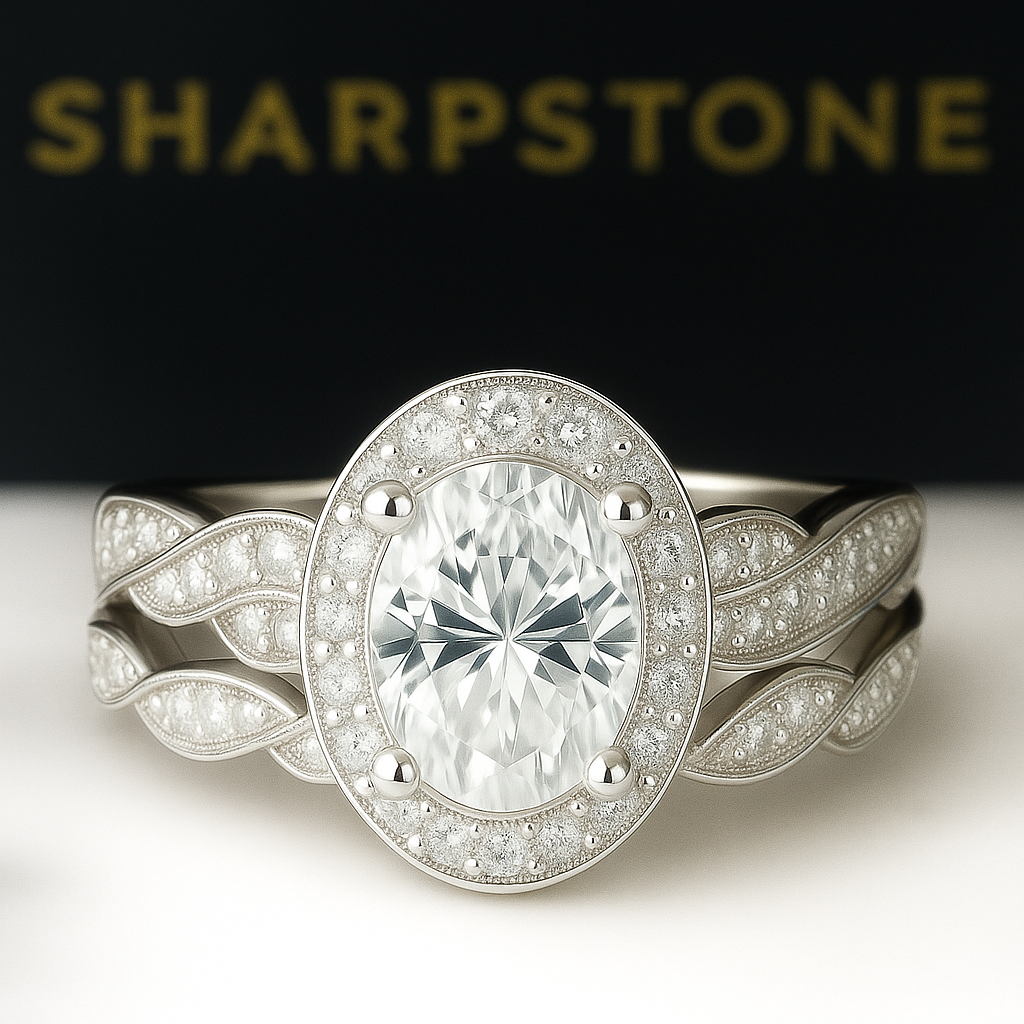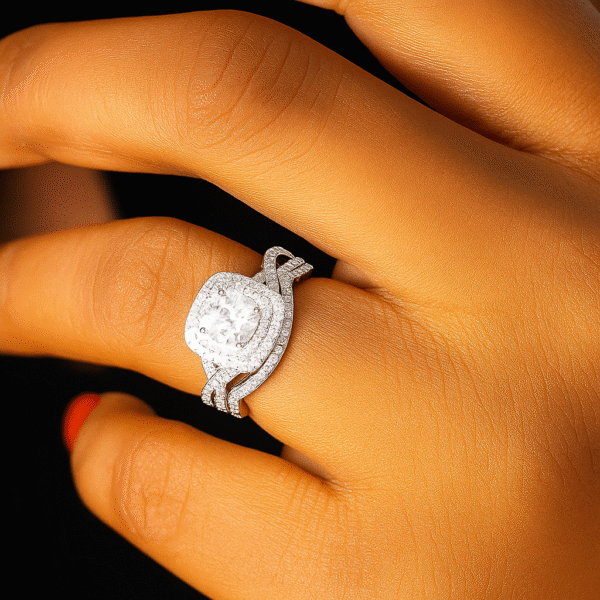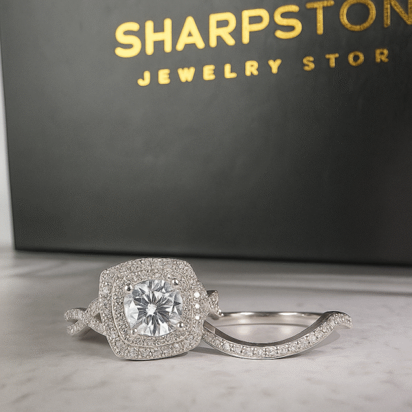 This exquisite bridal set features two sterling silver rings adorned with brilliant round-cut moissanite stones. The elegant halo and intertwining band design exude timeless sophistication.