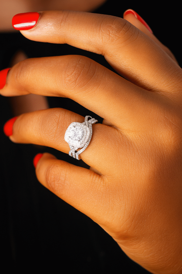 Isabella band combines a halo setting with intertwining bands for a sophisticated, eye-catching sparkle