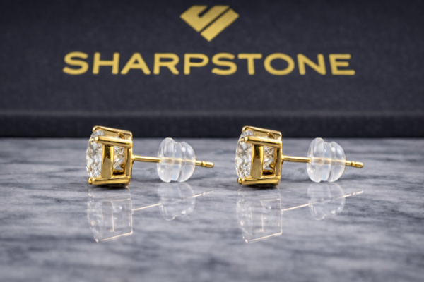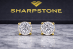 Lennon gold stud earrings showcasing a luminous round-cut moissanite centerpiece.