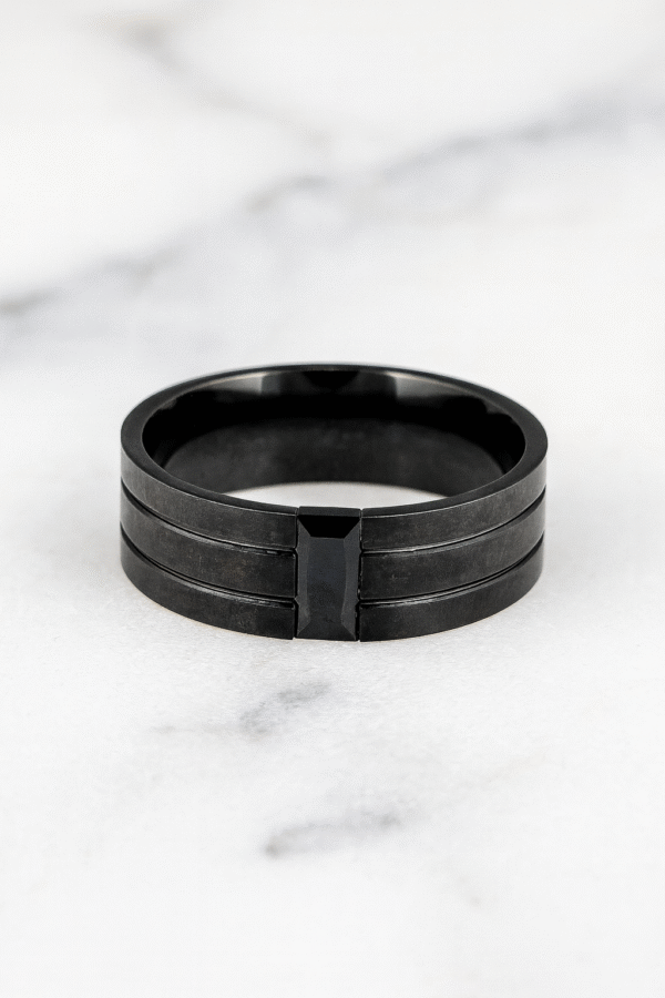 Magnus black titanium, this men’s band showcases clean lines and a distinctive rectangular center stone for a refined edge. Its matte finish and subtle grooves create a stylish balance of strength and elegance.