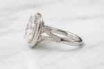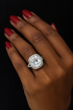 Natalia engagenent ring is a dazzling cushion-cut moissanite sits at the center, illuminated by a delicate round-stone halo.